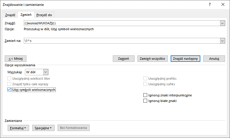 Symbole wieloznaczne, to specjalne znaki, które umożliwiają wyszukiwanie różnych ciągów znaków jednym zapytaniem. Włączenie tej funkcji umożliwi nam wyszukanie wszystkich łączników na raz, zamiast wyszukiwać i podmieniać każdy łącznik z osobna.