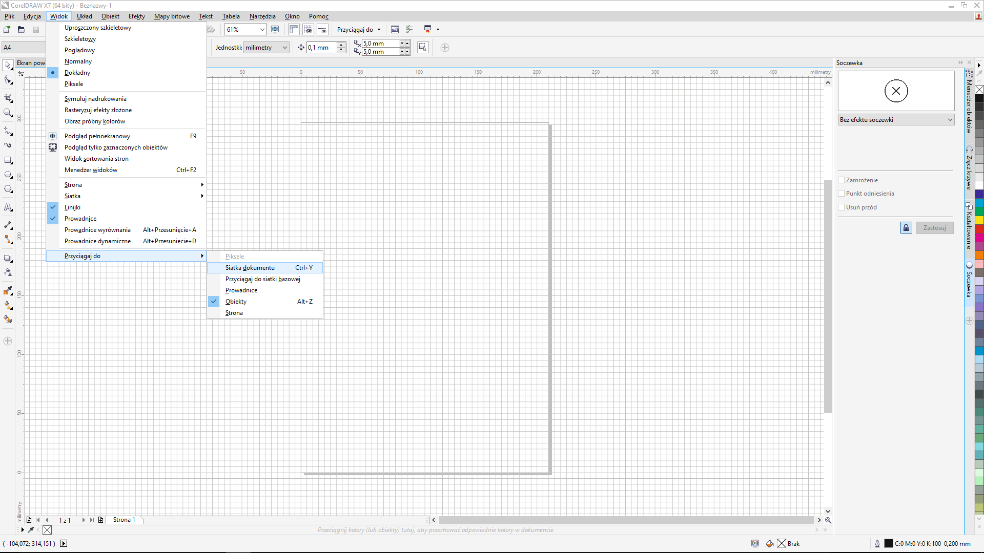 Następnie włączamy przyciąganie do siatki Widok/Przyciągaj do/Siatka dokumentu (ctrl+Y).